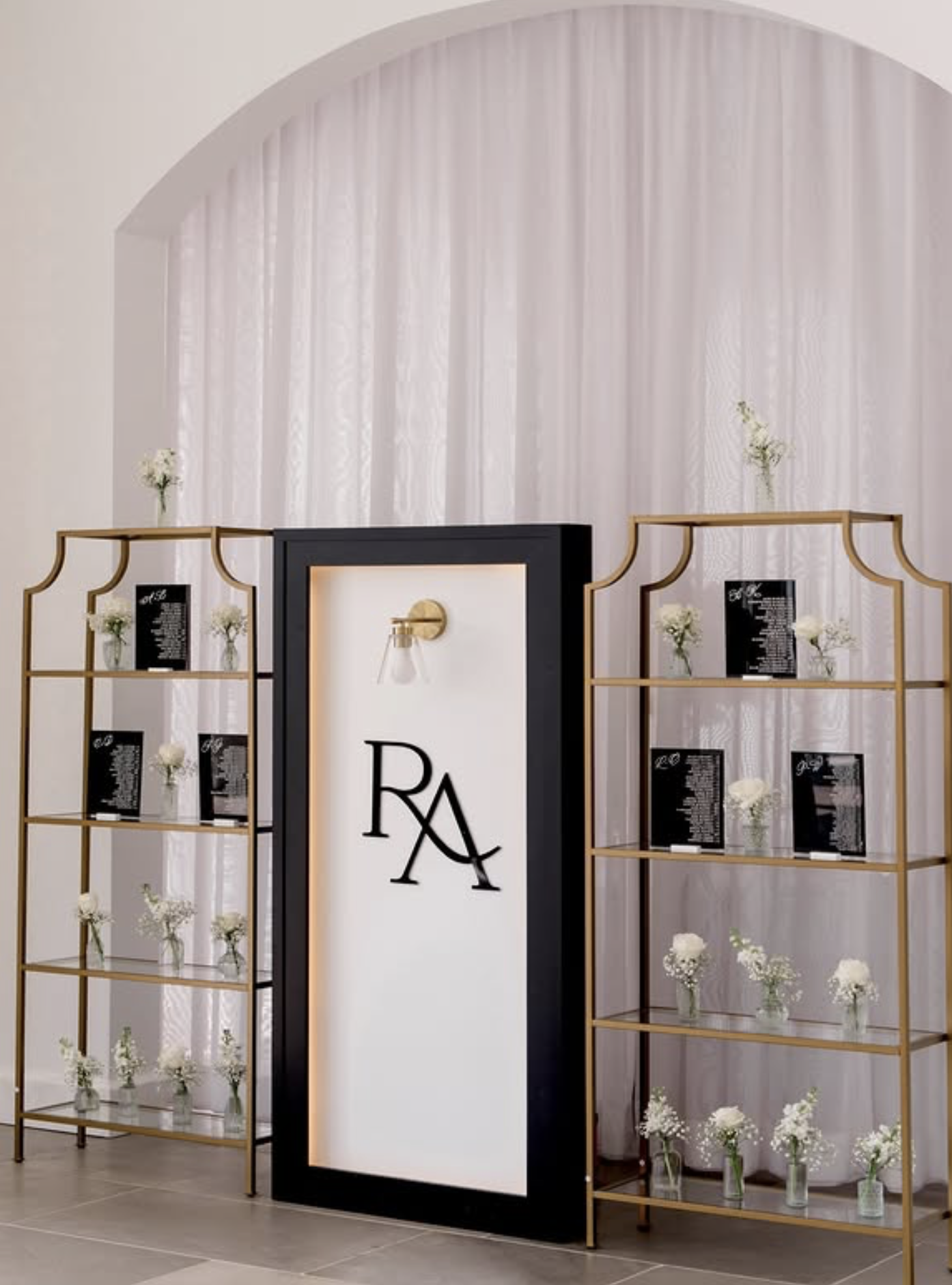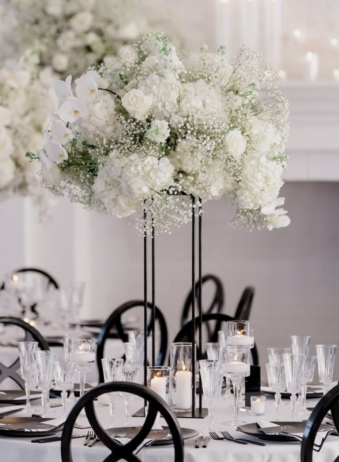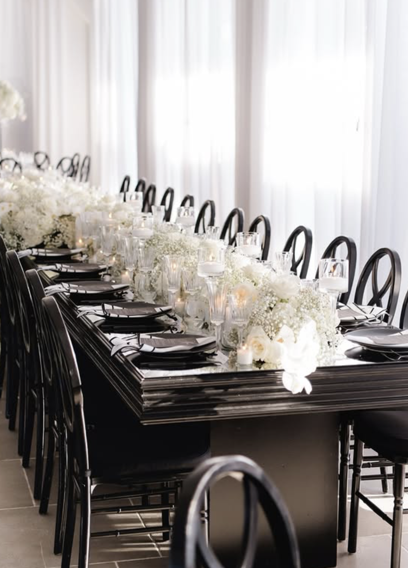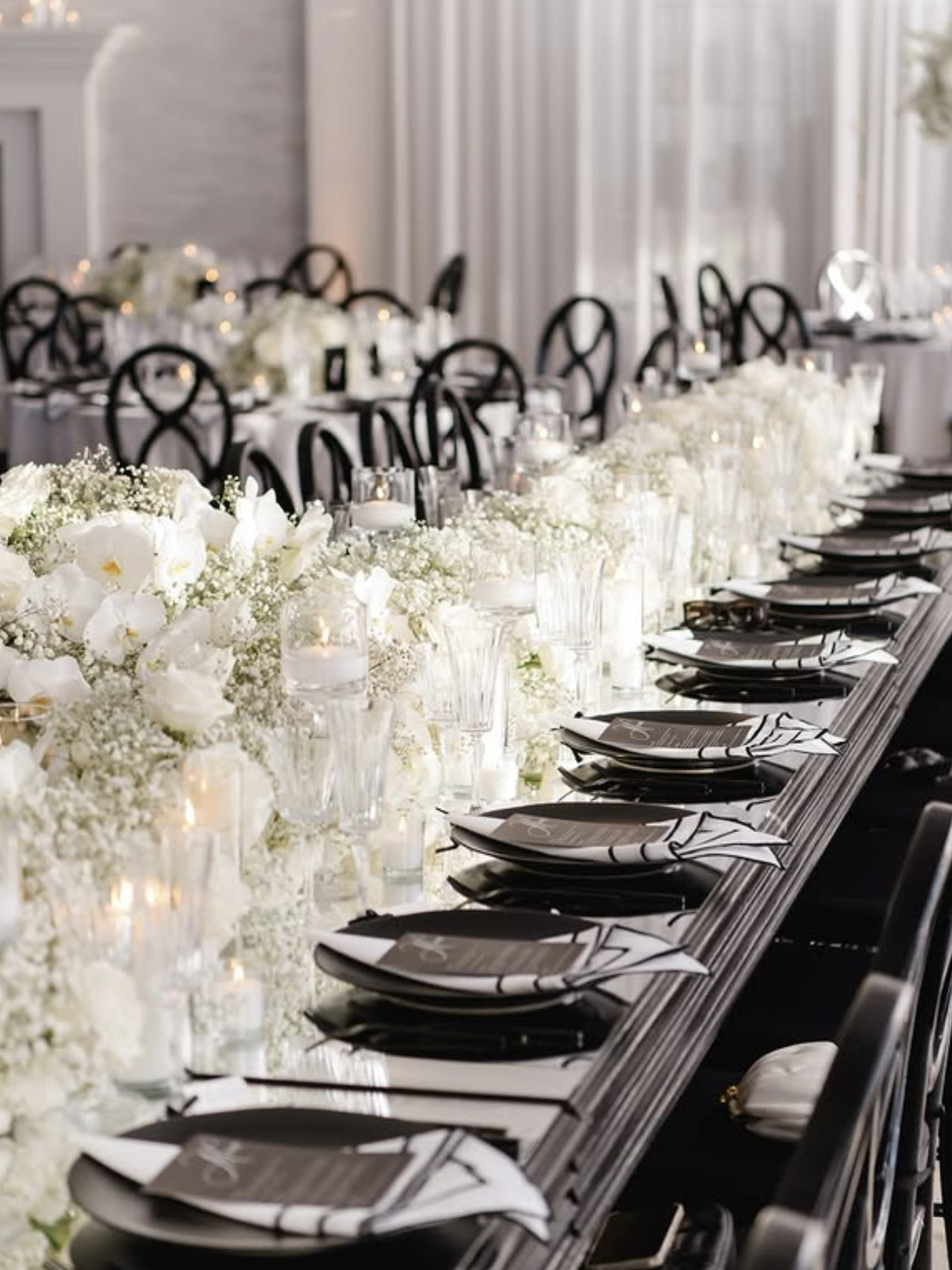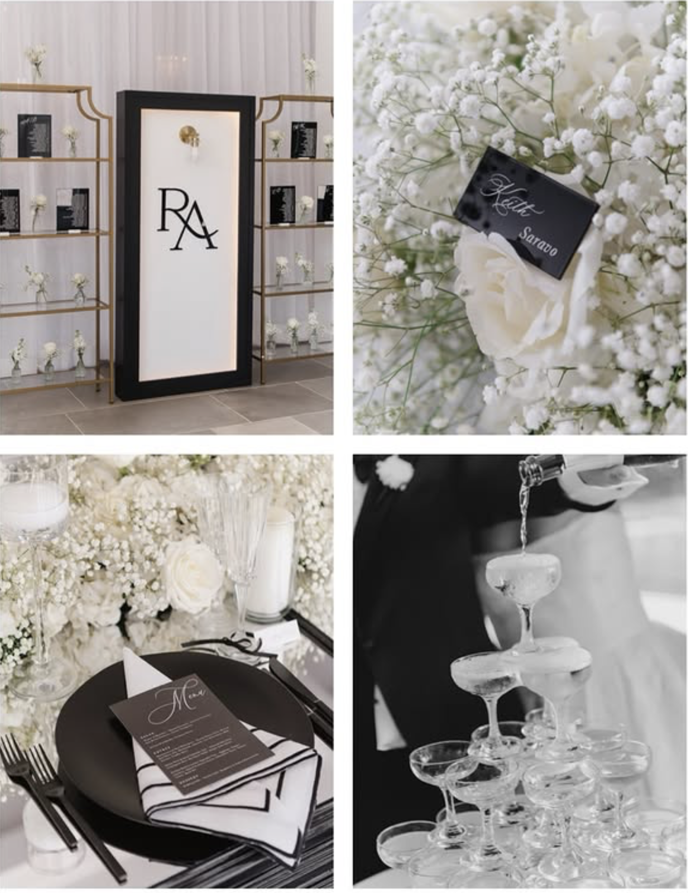 “Set against the breathtaking backdrop of Newport, Rhode Island, their black and white affair radiated elegance and sophistication. Every detail was meticulously crafted to reflect their love story, from the luxurious black-tie attire to the enchanting summer ambiance. The stunning floral arrangements, the exquisite table settings, and the unforgettable moments shared by family and friends came together to create a celebration that will be cherished forever.”
